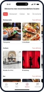 Découverte de destinations fluide : aidez les voyageurs à explorer les meilleures destinations sans effort. Notre solution propose des suggestions personnalisées et des recommandations locales directement dans votre application, pour un gain de temps et une expérience optimisée.