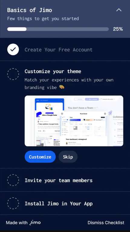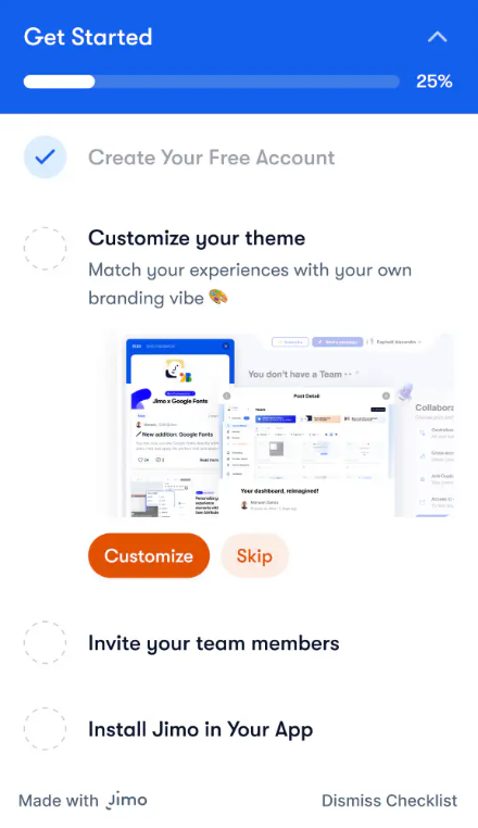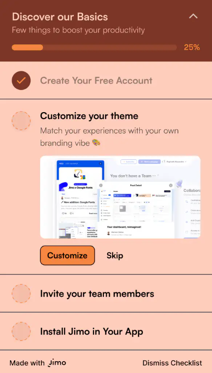 Jimo Checklists are fully customizable and designed to boost conversion rates and guide your users to their ‘aha’ moments faster