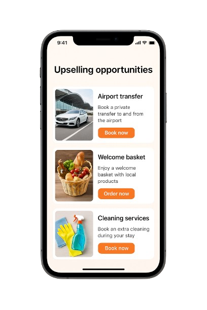 Boost Revenue with On-Demand Services Promote paid services such as transfers, welcome baskets, or housekeeping directly through the guide. Offer guests convenient options while maximizing your property’s additional revenue potential.